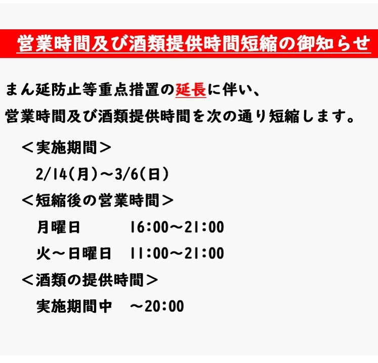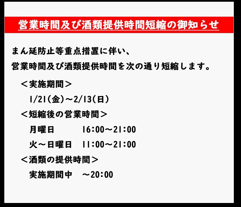 【営業時間及び酒類提供時間短縮の御知らせ】