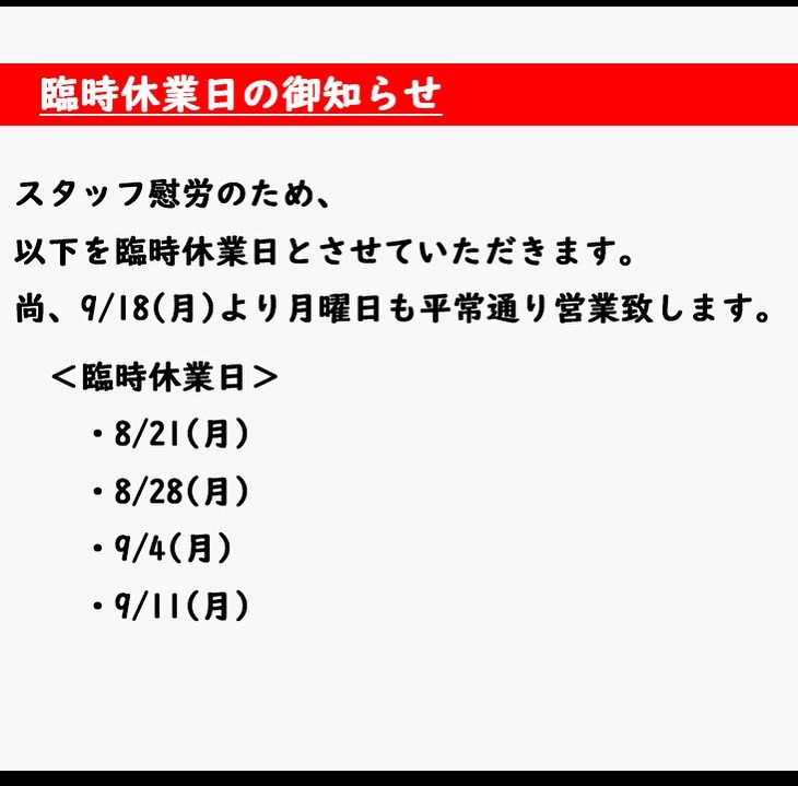 また、8/19(月)、8/20(火)は店舗工事のため休業とさせていただきます。