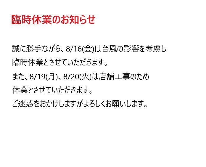 誠に勝手ながら、8/16(金)は台風の影響を考慮し臨時休業とさせていただきます。
